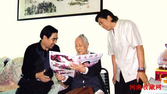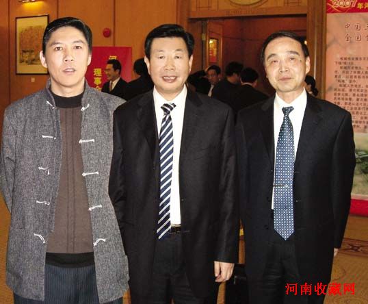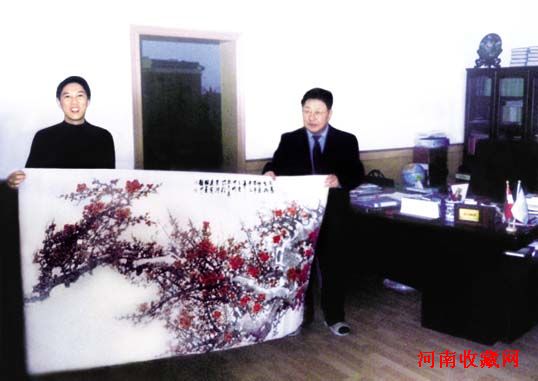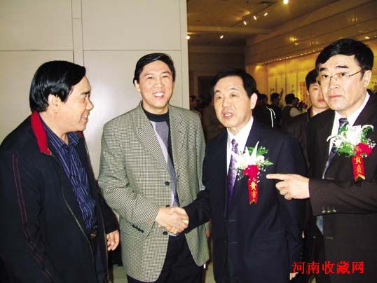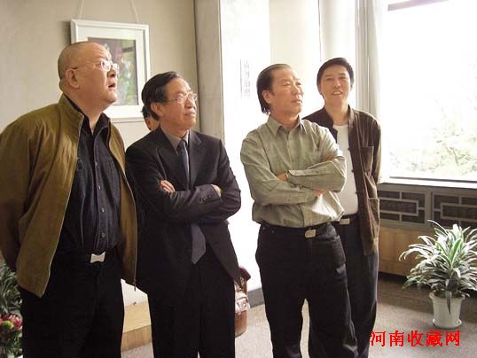 2007年12月28日,张志泉在省政协举办辞旧迎新梅花精品展时,中共十七大代表、原河南省政协主席林英海对展出的梅花作品给予高度评价。图为林主席与张志泉、傅世光、王宏忠亲切交谈。