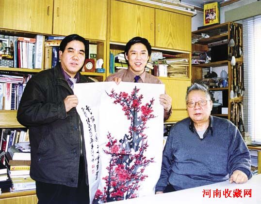 中央文史研究馆馆员、著名花鸟画大师张世简为张志泉梅花题词后与张志泉、中国比干书画院院长傅世光在家中合影留念。