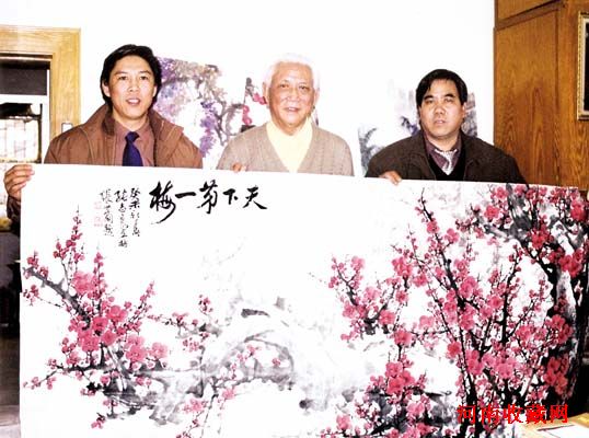 中国美术家协会会员,北京画院一级美术师,著名画家韦江凡为张志泉梅花题词后与张志泉、中国比干书画院院长傅世光在家中留影。