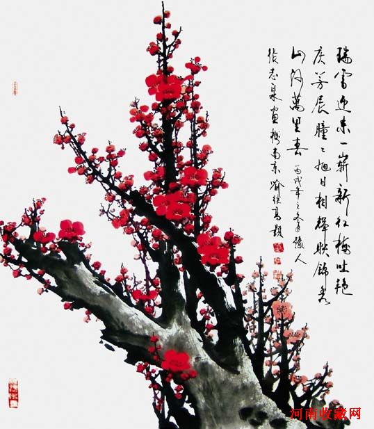 著名工笔画大师喻继高2007年2月在南京为张志泉梅花作品题诗一首:“瑞雪迎来一崭新,红梅吐艳庆芳辰;瞳瞳旭日相辉映,锦绣山河万里春。”