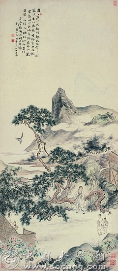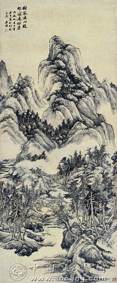 《山邨邨密图》是清初著名画家吴历绘于康熙丙辰(1676)年的山水佳作,纸本立轴,浅设色,纵127.5厘米,横53.5厘米。此画作于吴历45岁时,正值其艺术创作之高峰期,此后不久,他便随西教士游学传教,逐渐疏于绘事,这也是吴历作品流传不多的原因之一,然其绘画成就却为世人所公认,与王时敏、王翚等名重当时的画坛领袖并称“清六家”。此作原为朵云轩旧藏,并收录于《中国古代书画图目》(第12册第71页,文物出版社,1986年10月版),当为藏家所重。