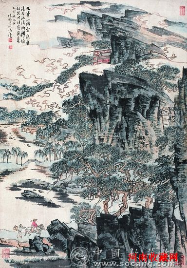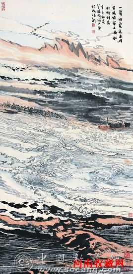 为纪念陆俨少先生诞辰100周年,本次西泠春拍除推出一批陆俨少自用文房雅具之外,由陆俨少夫人朱燕因女士旧藏的多幅陆俨少山水精品亦值得关注。《九华山图》作于1975年,是陆俨少描写杜牧诗意的一幅绝妙佳作,摄前人笔法融于自家胸臆,体现了艺术大师深厚的艺术造诣。《杜陵诗意图》纵138.5厘米,横68厘米,作于1991年,为其晚年妙笔,作品截取一段江水以平远构图营造既深且阔的画境,以其最擅长的勾水法准确体现了杜甫的归家之念。