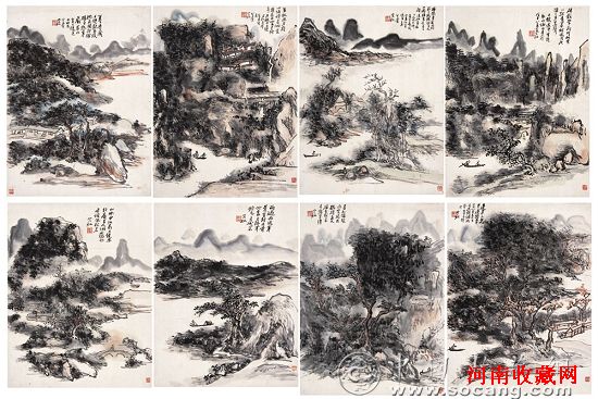 黄宾虹的《山水写生册》作于1948年,是黄宾虹85岁初到杭州定居时创作的一本纪游精品。共八开,纸本设色,各纵22.8厘米,横22厘米。册页原系当年宁波地委副书记陈耀亭的藏品,潘天寿题写签条。此册文革中遭遇传奇经历,是一本值得高度关注的黄宾虹晚年精工之作。