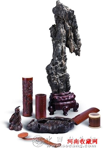 <--Content Start--> 供石竹雕 心居神游 西泠拍卖在08秋拍中推出的“中国首届历代供石专场”,以其独特的人文底蕴、丰富的石种、清晰的来源而一举成功,为金融危机下的艺术品市场吹进一缕春风。本次09春拍的供石竹雕专场,将延续文人清赏的意蕴,推出明清以来的灵璧石、太湖石、英石、昆石、黄蜡石、绿松石等三十多块佳石,或高耸奇险,或古拙厚朴,各具风情。这次专场的供石多为案头把玩的小件,不光英石、灵璧有诸多拳袖之石,太湖石亦有玲珑佳品,且多经常年把玩,包浆厚重,定将成为藏家青睐之选。 竹子历来是文人墨客涵咏称颂的对象,竹雕作品也因此成为文房案头不可或缺的清赏佳品。此次西泠竹石专场中汇聚了明清以来竹雕臂搁、笔筒、香筒、笔洗、圆雕人物、贴黄等竹雕精品。其中,三松制透雕人物香筒、杨龙石刻《饮中八仙歌》香筒、汪由敦铭竹雕笔筒、乾嘉时期竹器刻字第一高手邓渭的石榴诗文笔筒、清溪制“陋室铭”笔筒、明代荷叶笔洗,以及唐云、盛丙云、朱炳文合作的竹雕虫罐等都是值得藏家驻足的文玩佳品。