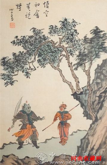 “这件作品确实非常难得,还没上拍就已经有不少藏家关注。”据国元广盛文物专家介绍,这件尺幅不大的书画作品,来头不小,它的作者是清朝第六位皇帝道光的第六子恭亲王奕?之孙溥心畬,他与张大千并称为“南张北溥”。溥心畬之所以会创作这幅画,主要是为了送给好友张学良留念。专家称,他最有特色的人物山水画,大都取材于古典戏剧文学中的故事情节,此作就是取材于古典文学中描绘的孙悟空形象。其作画喜熟纸,而此幅《孙悟空大战黄袍怪》之作为设色绢本,画作完成后便成为张学良定远斋所藏精品,现藏家是从天津文物公司2008年春节竞卖会上拍得的。