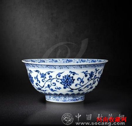 此件青花碗,纹饰描绘精细,疏密得当;画面线条优美流畅,笔意自然;青花色泽绚丽鲜艳,清晰明快;由于使用“苏麻离青”的原因,线条的纹理中有结晶斑点。碗口紧贴口沿处内部绘一圈缠枝花卉,外部绘一圈回文,内外两组纹饰的使用相得益彰;主画面为缠枝莲图案,画法为永乐典型的双钩填色,层次分明,小笔触渲染,缠枝飘逸流畅,莲花层次明显,生动细致;近底处绘一圈莲瓣纹与主画面遥相呼应,整体效果极佳;圈足外部绘一圈卷草纹,草纹疏朗随意又不乏精致细腻。整体纹饰精美飘逸,清醇明丽,为永乐年景德镇官窑器中之精品。