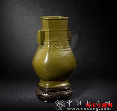 此件器物为贯耳尊样式,直口,直长颈,腹部扁圆,圈足。颈部两侧对称装饰竖直的管状贯耳,颈身凸起弦纹两周,下饰勾莲纹一圈。通体尽施茶叶末釉,釉色滋润失透,青绿色中夹杂黄色星点,古朴雅致,底刻“大清乾隆年制”六字篆书印款,为典型的乾隆朝官窑制品。