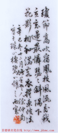二是以艳黑为主勾画山岭,以赭石皴染阴阳层次,墨色秀润磊落,次第有序,再以敷粉留白表现雪色。何氏在傅彩用料时,克服雪景色阶少的特点,巧妙地把粉彩玻璃白运用于雪景山水之中,使画面彩料浓淡自如,雪色逼真,层次有度,既有传统填色的粉润效果,又具有画意生动的意味。注重单薄中追求晶莹的效果,尤其是渲染雪雾天色,层次之微妙,表现出不凡的功力。而模仿品往往得其表象,多数在傅彩时为追求层次感而将玻璃白堆填较厚,用手触摸有起棱之感。