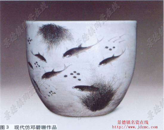 仿邓氏之赝品,大多是他的“鱼藻图”。邓氏20世纪20—30年代以画鱼藻为主,他的鱼藻画将中国画笔墨意趣与日本绘画技法相结合获得成功之后,又融入肖像画的细腻风格,堪称匠心独运。从笔墨特征来看,邓氏的鱼藻瓷画,主要有以下几个特点: