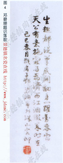 常见落款为:“铁肩子邓碧珊画于珠山客邸”、“铁肩子邓碧珊画意”、“邓碧珊画于珠山”、“铁肩子碧珊”、“碧珊写于珠山之南轩”等(图4)。