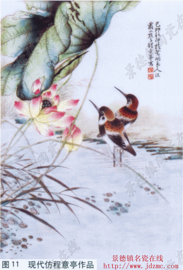 另外,程意亭花鸟画的设色,也是鉴定其作品真伪的重要因素,有以下几个特点:一是程氏所用颜料经过自己的漂研调配,色泽妍丽而不娇媚,在填色时又能轻拂丹青,以薄为贵,呈现出特有的清丽娟秀,既有文人画清雅的一面,又有工笔重彩的艳丽,艳者无飘浮感,淡者也非苍白无神,厚重浅淡之处,均以笔法皴擦染而成。二是填色工艺达到运用自如,驾轻就熟的程度。如程氏画花多用胭脂红洗染,浓淡相宜,过渡自然,颜色莹润;而填画荷花却着意淡雅,表现到赭色,既丰富画面色彩,又增添了生活的真实。而模仿品设色、染色平板,少冷暖过渡,特别是用色生硬,往往以色料堆填以求艳丽,鉴赏者用手触摸有起棱之感(图11)。