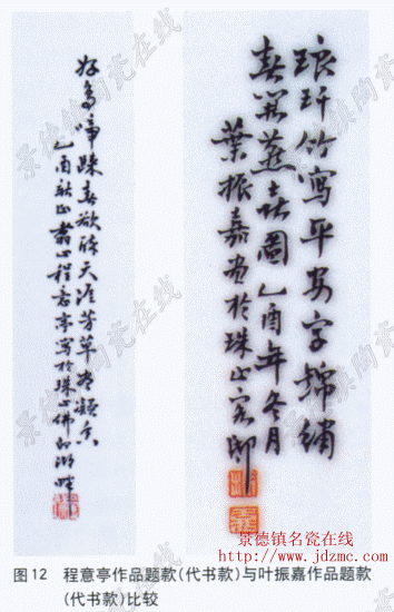 另一类是他人代书款,书体劲拔,格式工整,多诗词。此类题款系民国时期景德镇专事题款之人所为,此种字体在同时期其他瓷画名家作品中也能见到。如同时期瓷画家叶振嘉的作品上也是此种字体,从两种题款比较中,可看到字体完全出自一人之手(图12)。民国时期,某些瓷画家请人代写款的现象时有出现,因此在鉴定程氏作品时,不能只从题款来判定,尤其是此类代书款作品,要多从其他各方面来鉴定其真伪。