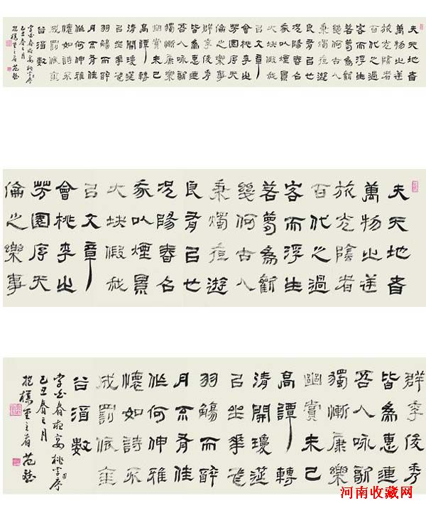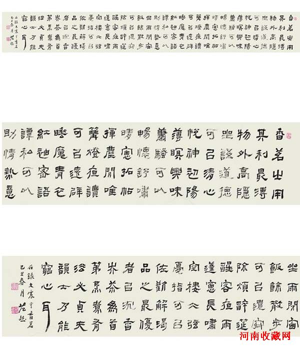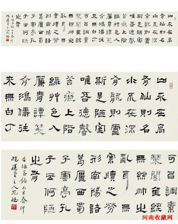 清代的隶书创作,是汉以后的又一高峰。有清三百年间以郑谷口、金农、伊秉绶为代表。邓石如、何绍基、赵之谦也工隶书,达到了相当水平,然而对汉人精神把握上不如郑、金、伊诸家,且邓失之匠气,何失之习气,赵失之薄气。