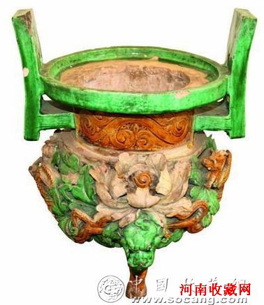 对比同时期炉类,此炉体形硕大。以较为特殊的绿色釉为地,间施黄白色釉分别装饰龙纹与牡丹纹,形成鲜明的对比。颈部刻划香草纹,腹部使用高浮雕技艺来表现两条飞龙游戏在盛开的牡丹花之间,龙型写意潇洒,牡丹栩栩如生,叶片错落有致。工艺精湛,尤为生动。炉身由狮首三足托起,更加彰显气势。
