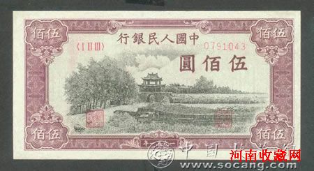 “瞻德城”是抗美援朝时期发行的货币,于1951年发行,流通时间仅为3年7个月,票面中部为赡德城图,主色为黑色,背面主色为紫色,尺寸为134×70mm。纸张无水印,但在三大珍中,“瞻德城”的暗记较多,票面左边草丛中从左到右分别有“抗”、“美”、“援”、“朝”四个字,票面右下面额上花中有一“中”字;背面中间少数民族文字中有“500”数字,少数民族文字右侧有一个“5”数字。该券的7位号码中,首位数未见4以上数字,因此行家认为当时其发行量应该未超400万枚。根据2004年行内专业人士联合统计,有正确资料或实物证明存世的“瞻德城”只有64枚。如统计未公开面世的券,则目前存世总量应难超百枚。8月14日将进行拍卖的嘉德在线第八十二期大众收藏拍卖会,近期有幸征集到的一枚“瞻德城”,将于8月14日进行拍卖。