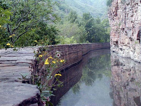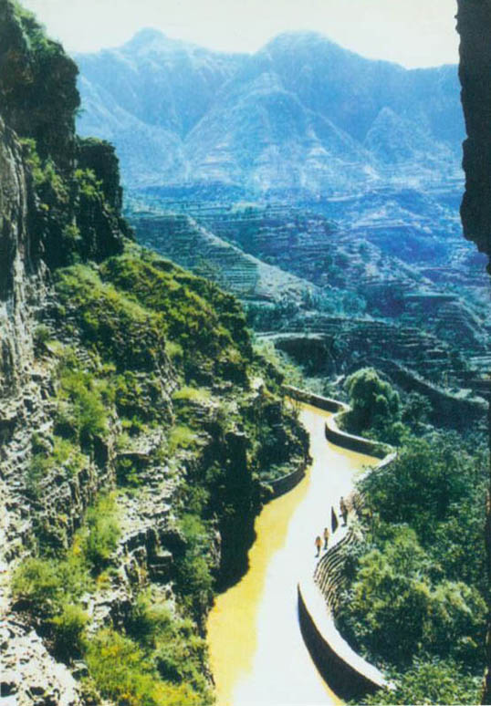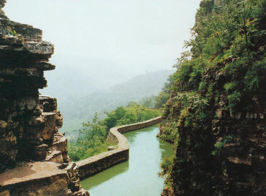 1960年林县人民在太行山悬崖峭壁上盘山开凿,修建了总长近2000公里的红旗渠,从山西省平顺县侯壁断下绝引漳河水入林县。沿漳河南岸绕悬崖,越峡谷,逢山开洞,遇河架桥,开凿长达70公里的总干渠,渠高4.3米,宽8米,引水量18 .3立方米/秒。从分水岭向下,分凿三条干渠。第一条干渠沿太行山东麓向南与英雄渠汇合,全长41 . 5公里,著名工程有桃园渡桥,桥长100米,高24米,宽6米,其上可行汽车。十干渠与英雄渠汇流处称"红英汇流",渠水奔腾,飞瀑喷雪,好似银河倾泻。第二干渠全长48公里,东南流入安阳县。第三干渠东北流经4公里长的曙光洞而入东岗乡。整个工程劈开山头1250座,凿通隧洞211个,架设...