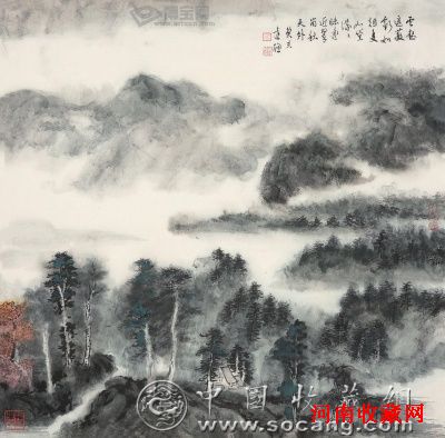 黄达聪(1914-2001) 隔水人家; 设色纸本 镜片 1985年作 估 价 RMB:15,000-25,000