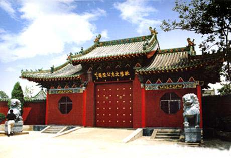 外照壁高5米,长6米。大门三间,门前左右有台阶,阶旁各有一衔环石狮。内照壁与围墙同高,将庭院分为前后两部分,左右各有便门。庭院中间修有南北甬道,直达大殿。甬道两侧立石猪、石羊雕塑,对称排列。甬道两侧各建厢房3间。