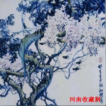 上述几点, 不仅是笔者所绘制的青花斗彩花鸟画的特色,而且是笔者在经过多年的摸索和锤炼之后,在材质的把握和运用上,从量变到质变的发展进程中, 逐步在青花斗彩花鸟画创作中形成了自己独特的艺术风格。