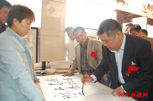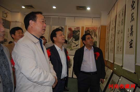 河南日报报业集团总编辑常法武,新乡市委常委、宣传部长邢亚平参观由中国比干书画院院长傅世光举办的秦岭云、卢光照、张志泉、卢世明书画作品纪念特展。