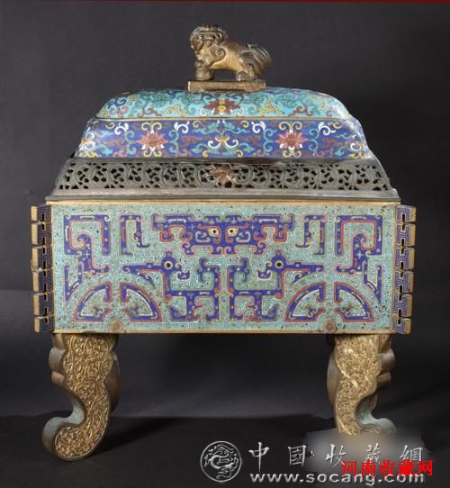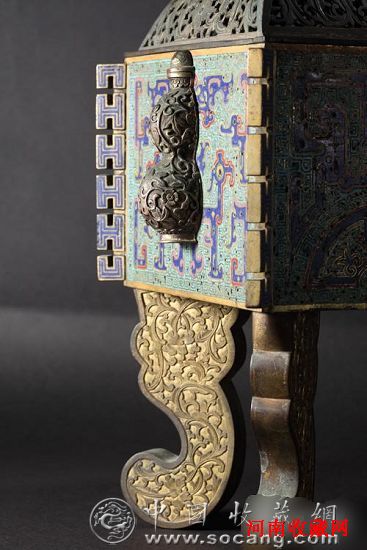 09歌德春拍的一件掐丝珐琅出戟尊从6万起拍被买家竞至170万的场面记忆犹新,秋拍百家文房专场即将推出的一件铜胎掐丝珐琅长方炉又将成为引人注目的焦点。这件铜胎掐丝珐琅长方炉,体量大,手感厚重,掐丝匀细流畅,花纹设色饱满奇古艳丽,鎏金璀璨夺目,充分体现了清王朝乾隆时期内廷珐琅工艺登峰造极的工艺成就。但是这件铜胎掐丝珐琅长方炉的特殊性却不在它的各个部分所表现的珐琅工艺的美而在于它作为实物遗存本身所传达的一种珐琅工艺的文化信息。