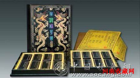 笔墨纸砚是文房之魁,中国嘉德2007秋拍一套“清乾隆御制西湖十景彩墨”,以448万元人民币的价格成交,至今仍是宫廷御墨的世界拍卖纪录。此次秋拍,中国嘉德再次推出从美国征集到的成套集锦墨—“御制棉花图墨一盒”,势必刮起新一轮旋风。此墨共十六锭,将布种、灌溉、耘畦、摘尖、采棉、拣晒、收贩、轧核、弹花、拘节、纺线、挽经、布浆、上机、织布、练染十六步棉花耕作的全过程呈现于上,墨一面刻画场景,一面题御制七绝诗文。此套墨为乾隆三十年(1765)所制,带有黑漆描金双龙戏珠盒,上写“御题棉花图”,分上下两函装,制作极其精致,另附有宫廷原装锦套和黄绫签,经知名古墨收藏大家张絅伯先生收藏,流传有序,堪为至宝。