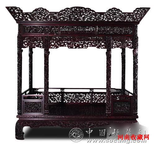 介绍: 架床以紫檀木制成,面下有束腰,澎腿澎牙大挖马蹄。以深浮雕手法刻云龙纹。牙条下沿垂洼堂肚。面上三面围栏,装透雕两面作龙纹绦环板,四角及前沿立柱,以圆雕手法饰云纹及龙纹。立柱 上装挂牙、眉板及毗卢帽,均以透雕手法饰云龙纹。此床形体高大,用料粗壮,雕刻花纹线条流畅,形象生动,具较高艺术价值和收藏价值。
