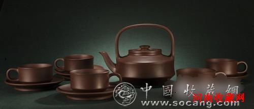 介绍:这套茶具集壶、杯于一体,构思巧妙,形制完整。该茶具整体为上下两段的组合结构,上段为壶身,长嘴,扁平圈把,直身、平肩、嵌盖、柱钮,形制在统一中求变化;下段为四面洞开,恰好容纳四个茶杯,集壶、杯于一体,匠心独具。