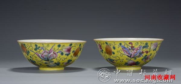清道光黄地粉彩描金瓜蝶连绵碗(一对)