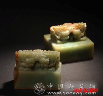 清代,以翡翠制作宝玺等具有明显等级特征的器物有如凤毛麟角,非常少见。用翡翠制作的皇帝玺印,这两方是目前仅有的两、三例之一。两方宝玺制作极为精细。在材质色泽利用上,将红翡部分安排在整个宝玺上面,雕成龙的角和背脊,颇具匠心。尤其是交龙钮的雕制线条细劲流畅,一丝不苟,双龙形象设计规范但不呆板。印钮与印体之间比例协调,恰到好处。