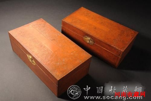 “清乾隆 竹贴黄刻云龙御题诗文长方盒”,盒面雕刻两条竖龙脚踏海水江崖,在云海中搏击翻腾,体态舒展,苍劲雄浑。龙是封建社会皇权和皇帝的象征,它是乾隆时期各种器物中经常使用的装饰纹样,具有典型的皇家风采。