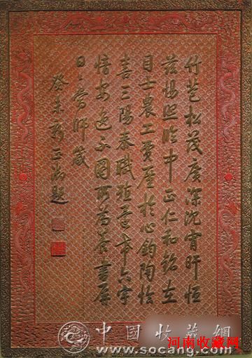 挂屏呈长方形,通体剔彩,分层髹涂红、绿等色漆,屏中心以雕刻的祥云纹为地,刻乾隆行书题诗一首:“竹苞松茂广深沉,宵旰恒兹惕照临。中正仁和铭在目,士农工贾廑于心。钧陶恰喜三阳泰,职殖遍布六宇愔。安逸不图所为养,书屏日日当为师。”末署“癸未新正御题”,下钤“乾隆御笔”等两方印。四周饰有云龙、缠枝花卉纹一周。
