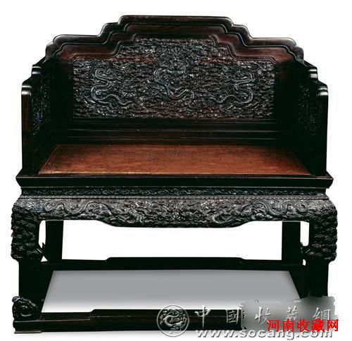 宝座,是帝王后妃宫殿正中设置的专座,亦为皇权至高无上的象征。御用宝座主要分为两种,一为木制髹金漆或朱漆金饰;一为硬木精雕细琢而成。其中,紫檀木制宝座又有实木与包镶之别,各展其华,气度非凡。紫檀因材质贵重、稀有,工艺精湛、特殊,倍显珍贵,皇家应用亦审慎为之,似乎可解此件紫檀雕云龙纹宝座属后者。