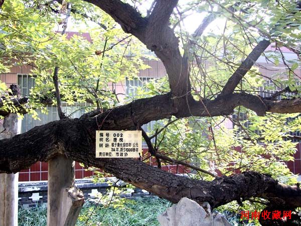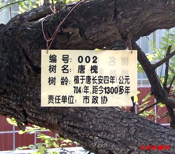 2009年11月3日,记者去新乡辉县市政协采访,看到院中长有一千年唐槐,树冠十米,高四米。更为神奇的是由于年代久远,树干已全部长空,仅有很薄的部分相连,里边可以钻进一人。然而,该树枝叶繁茂,不得不用水泥柱子支撑树枝。