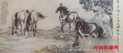 此幅四骏图以四匹矫健的骏马比喻中国人民勇往直前,不畏艰苦的革命斗争精神。徐悲鸿以极大的勇气反动于强调线条工细的画马传统,而以富有变化的大块灰墨绘出马的体态,流畅而率性地勾勒出马的躯体结构,简练而精确,刚柔并济的寥寥数笔写出四肢的主要骨骼肌肉,再用浓墨点出头部五官特点,最后以硬笔焦墨扫出随风飘舞的鬃尾。画面用笔纵放淋漓,但造型结构却十分严谨与凝炼又结合西方的块面与光影,浓墨与淡墨交错,湿笔与枯笔互辉,把马的形象表现的十分强健。他的马几乎都不用背景,如此幅只用淡墨渲染了广阔的万里疆天,马仿佛破空而来,飞掠而至。全天依傍,观者凝目之时,那种风雷气势已经扑面袭来。马是徐悲鸿先生一生中最爱描绘的题材。他画的奔马,笔墨淋漓酣畅,带着时代的风雷驰骋在画坛上。给当时中国画坛带来了清新、有力、刚毅的气息。此幅佳作为徐悲鸿画马成熟时期的代表作,其艺术价值自是不言而喻。