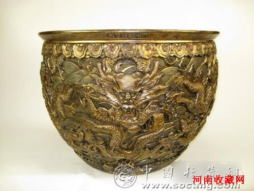 此缸通体鎏金,造型大气磅礴,做工精美绝伦,九龙栩栩如生,实为缸中罕见之精品,颇受收藏者的青睐。