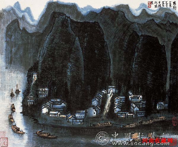 深厚凝重,博大沉雄,这是李可染山水的精神!在他的山水世界里,有江南春雨的诗意、有漓江山水的胜境、有黄山松云的雄奇、有革命圣地的激情……所有这些,又都处处流露着作者群于写生、精于观察的印迹。位于漓江西岸,风景秀丽的阳朔是李可染甚为喜爱的地方,他曾经游览过多次,也为此创作过多次,比如1959年的《阳朔穿山渡头》、1962年的《素描屏风望阳朔城》、1962年的《阳朔渡头》、1972年的《阳朔》以及达73平尺的《阳朔胜境图》等。此幅《阳朔一景》创作于1963年,与同时期的同题材作品既有相似之处,又有布局上的新意。群山叠嶂下,山脚的房屋与来往的行人,给山增添了一份亲和力,就在如此细密的地方,房屋、亭台、山门井然有序;十来只小船穿行于山水间,增加了画面的韵律感,而左侧绵延的水面又使画面有了无限的延伸空间。对“黑”与“白”的巧妙运用,是“李家山水”一绝:黑的浓烈与白的透亮,同样是那样的热情,那样的澎湃!1962年,李可染曾偕夫人邹佩珠一起来到阳朔写生。当离开阳朔前往广州从化温泉时,李可染由衷慨叹:“阳朔山水,一辈子也画不完!”此件《阳朔一景》落款曰:“阳朔一景。一九六三,可染于从化温泉。”正是这一时期创作的见证。