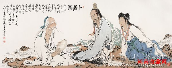 当代书画板块,也有不少精品呈现。比如,范曾的《卜居图》,这是作者于1989年精心创作,首次在香港“范曾•宋雨桂•冯大中香港联展”上公开展出,出版于《莽神州赋》画集,一经面世便被名家收藏的精品造像之作。作者以丈二整纸造像,可谓胸有成“像”,如果不是心灵沟通与共鸣,绝无此传神之作。后来虽有丈二巨制,甚至有《陈省身与杨振宁》的传神造像,但往前寻找,尚无巨幅整纸造像记录(以1200万港币成交的《丽人行》画高也仅为80CM),此作堪称屈原最早、最大的标准像。至于画作选景围绕《上善若水》为背景,其后江河滔滔,利万物而不争,其优劣高下,远非观者评说,只是依观者参悟多少罢了。整幅画作线条流畅、痛快淋漓;仿佛刀劈斧切般一气呵成。用墨生动;设色自然传神,润味十足生动的表达了人物感情。