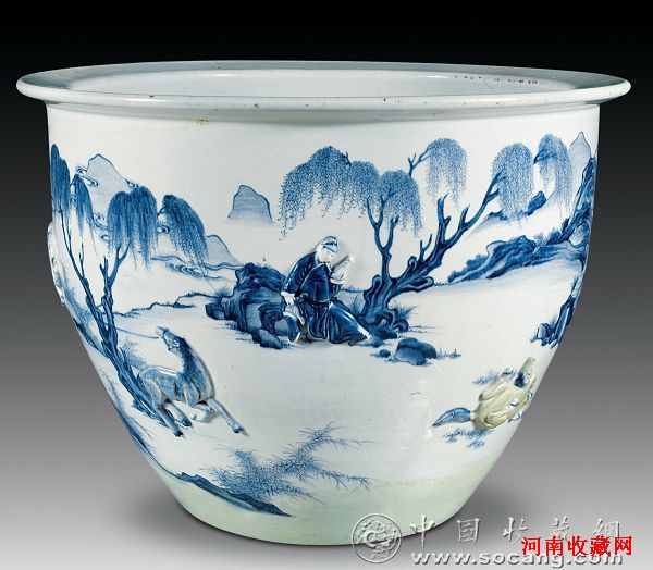 清康熙 釉下三彩周穆王八骏图纹大缸