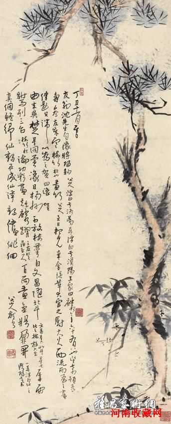 书画专场推出的三百余件拍品主要以清代和近现代为主。最为引人注目的是古代名家八大山人的水墨精品《岁寒三友图》。此画作以松竹梅为创作主题,最绝妙之处是用大段文字题跋来表白自己的处世风骨,通过有形的绘画并佐以诗文语言,作无可奈何的自我暗喻;画笔趋向外柔内刚,浑朴自然,气质敦厚,灵逸之气内蕴,用墨更是含蓄,明净中给人一种凝重而清润的感觉。