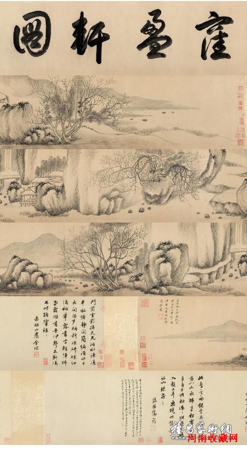 元代曹知白的《漥盈轩图》得到众多名人大家赏识,如签条为吴大澂所题,尾跋分别为明代书画家金琮、明代文学家书画家陈继儒、清代鉴赏家罗天池、著名鉴藏家金石学家吴荣光、古物鉴赏家程琦所书;此画又经文彭、项元汴、朱彝尊等名人收藏,是一件精品得力之作。《溪山无尽图》为康熙癸未四十二年即公元一六八三年作,清代“画圣”王翚,时年五十一;在王翚的整个绘画生涯中,这段时期是其艺术的黄金期。另有留传至今极少的牛石慧作品《芭蕉鸟石图》,牛石慧,世人认为与八大山人有直接关系,一为“牛石慧即八大山人”,二为“牛石慧即八大山人兄弟”,三为“八大山人与牛石慧乃是法门兄弟,即师兄弟”。再有多次著录的房从真《西域人马图》、董其昌《行草中堂》、沈 周《月燕记》、吴 历《溪山草庐》等。