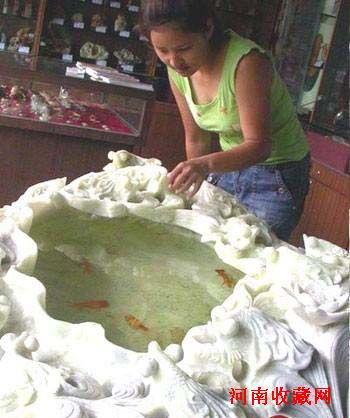 在成都送仙桥艺术城展出的一款身价16万元的鱼缸让人大开眼界。该鱼缸由1000公斤岫玉打造而成,工匠师傅花了足足半年时间。鱼缸呈青白色,长1.2米,上面凿了14只金鱼,既传统又不失现代特色。据鱼缸的主人说,岫玉堪称国玉,由此打造的鱼缸极具收藏价值。