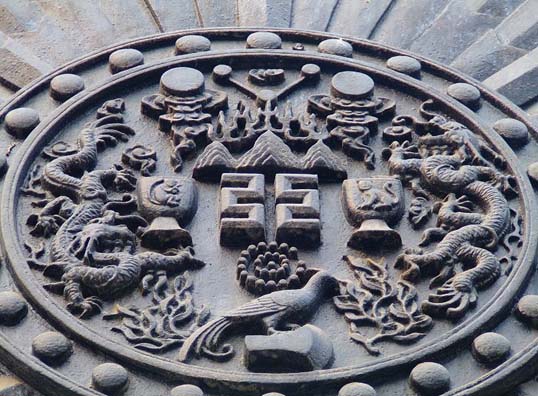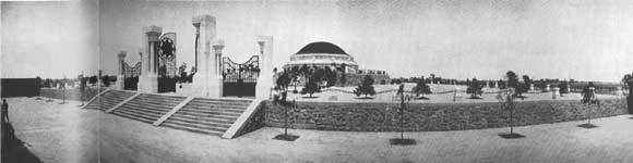 过墓前大殿不远,有三孔大门,这是典型的欧式墓门。中间一门,为纯铁铸造,正中悬挂墓徽。铁门后,是墓室,全用现代钢筋水泥浇铸,高三层。整个陵台区全用了欧洲筑陵的方式,布置疏朗,简朴大方。