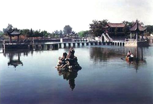 站在游廊桥上,凭栏南眺,南湖风光,一览无余。南湖面积2.9万平方米,湖内兴建了国家级标准游泳池和儿童游泳池,湖中央各种游艇、划船等游乐设施应有尽有,体现了“北湖游览,南湖游乐”、“北湖静,南湖动”的景区特色。南北两湖,清涟荡漾,象两株出水的并蒂莲花,争芳斗妍,竟相媲美。每逢佳节,灯会、水鸭、烟火等民间娱乐活动再起高潮,游人如织,摩肩接踵。