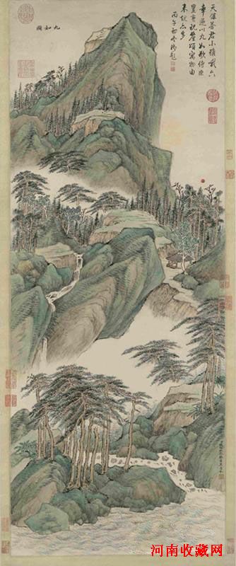 清代宫廷画家钱维城所创作的山水画作品《九如图》(设色纸本,立轴,估价:2,200 万至 2,800 万港币)。画面展现的崇山峻岭、高冈平阜、溪泉江河,以及苍松翠柏、东升旭日等景物,都是依据"天保九如"诗意构思的,故而明显地寓有祝颂福寿绵长之意。物象的象徵性也使作品有别于一般描绘自然景致的山水画,其境界更见高旷,宏阔、峻伟、绚丽,带有较强的理念性和理想化色彩。此图是临董其昌之本,在基本保持塬作面貌同时,又有一定变化。画中带棱角的石形、双勾少皴的树干,以及中锋含蓄的细笔、淡墨勾皴的綫条,都存有董氏遗意。然更趋缜密的用笔和青绿、赭石相间的设色,又显现自身追求,呈一定的宫廷富贵气息。此图当属钱氏摹古、仿古画中别具情趣之作,最终以2642万港元(3,424,698美元) 成交,取得良好成绩。