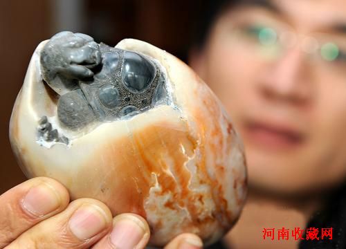 玉雕工艺研究所的工作人员在展示《寿龟破壳》玉雕