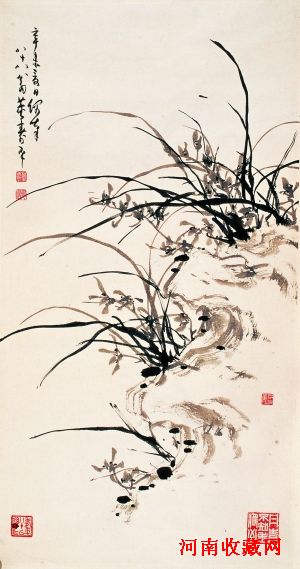 中国书画(三、四)中既有近现代名家的精心之作,亦有当代书画界领军人物的精妙佳构。齐白石的《长寿三千年》是一件难得的精品,著录于《天六书房中国名书画收藏图鉴》,画面右下角有齐白石钢印。徐悲鸿创作于1941年的《鹰》正腾空飞翔,伸展的翅膀与锋利的鹰爪显示了一种生命的张力和咄咄的气势。傅抱石的《观瀑图》作于1963年,作者时年六十,虽属晚年,却正处艺术创作的巅峰时期。傅抱石笔下的飞泉瀑布,如他酒酣兴起放笔一样,洒脱淋漓,具有强烈的感染力。观览者大有身心俱被荡涤的痛快。当代书画领域,也有不少佳构,如白雪石、何家英、史国良等。白雪石作品专题展现了“白派山水”的独特风貌,白雪石以漓江山水为表现对象,通过多年的艺术探索,形成了自己独特的艺术语言。