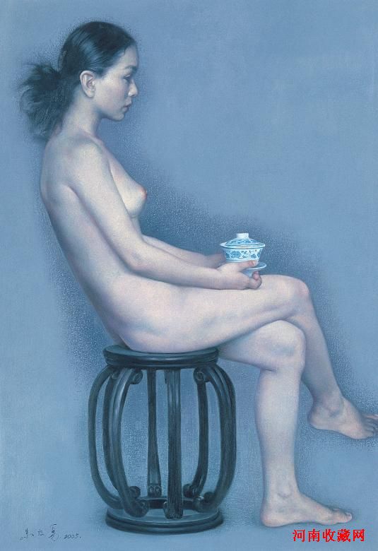 朱毅勇早在八十年代就以著名的四川画派中坚的身份蜚声画坛。他的人物形象更有东方色彩、亦具古雅,个人画风偏向怀斯现实主义风格。本次参拍的《盖碗茶 NO.2》这幅作品以靛蓝为底,画家以干净的笔触勾勒出少女端坐的形象,人、椅、底浑然一体,而又层次突出。画家以欢快的明度强调少女手中的盖碗茶,使其成为整幅画中最具生命力和跳跃感的焦点。