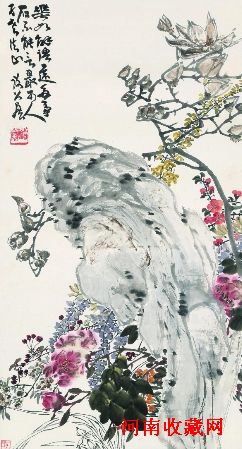 此次拍卖中谢公展作品《玉棠富贵图》,有蔡元培的上款和收藏印章,见证着蔡元培与海上画家的一段交往。在款识中,艺术家写道:“花如能语还多事,石不能言最可人。孑老法正,谢公展”。谢公展善画花鸟虫鱼,尤擅画菊花,有“谢家菊”之称。上大下小的卷石,占据了画面的主要部位,石旁玉兰、牡丹、海棠、水仙以及藤花串串,热闹非凡,洋溢着喜气愉悦的气氛。全图雄劲挺拔,色墨交融,又不失典雅的韵致,体现了谢公展绘画的典型风格。孑老是艺术家对于蔡元培的尊称,图面左下角钤有蔡元培的两方收藏印,更显珍贵。
