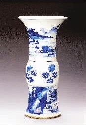 清朝康熙青花山水人物纹花觚,釉质细腻,器型优雅,花卉纹饰简洁干净,山水和人物画面意境悠远,犹如国画。